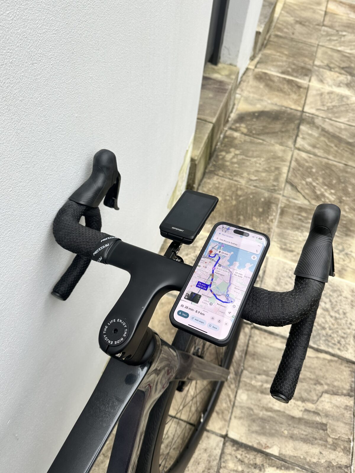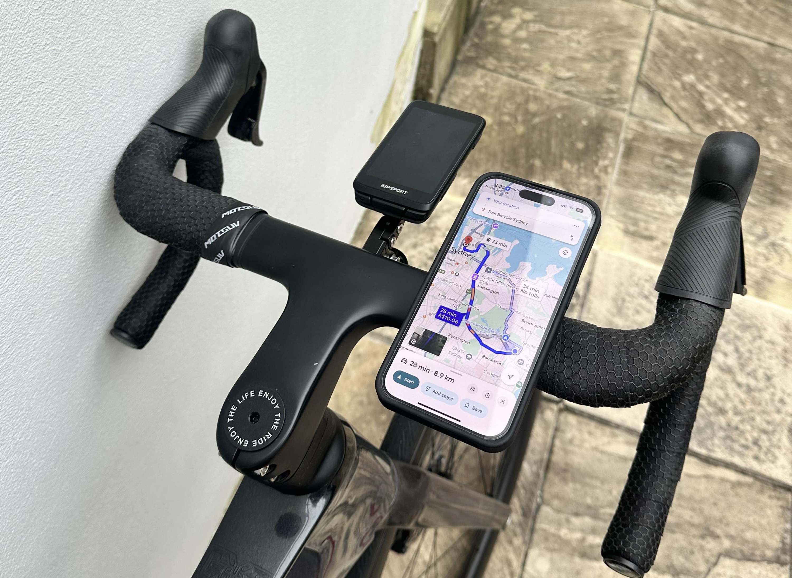 The Universal bike mount is a versatile, compact unit that attaches neatly to the handlebars or stem. It ships with two different strap lengths to suit various bar diameters, and once installed, it’s easy to switch between portrait and landscape orientation.